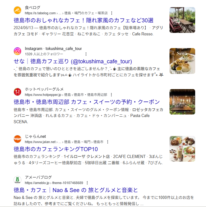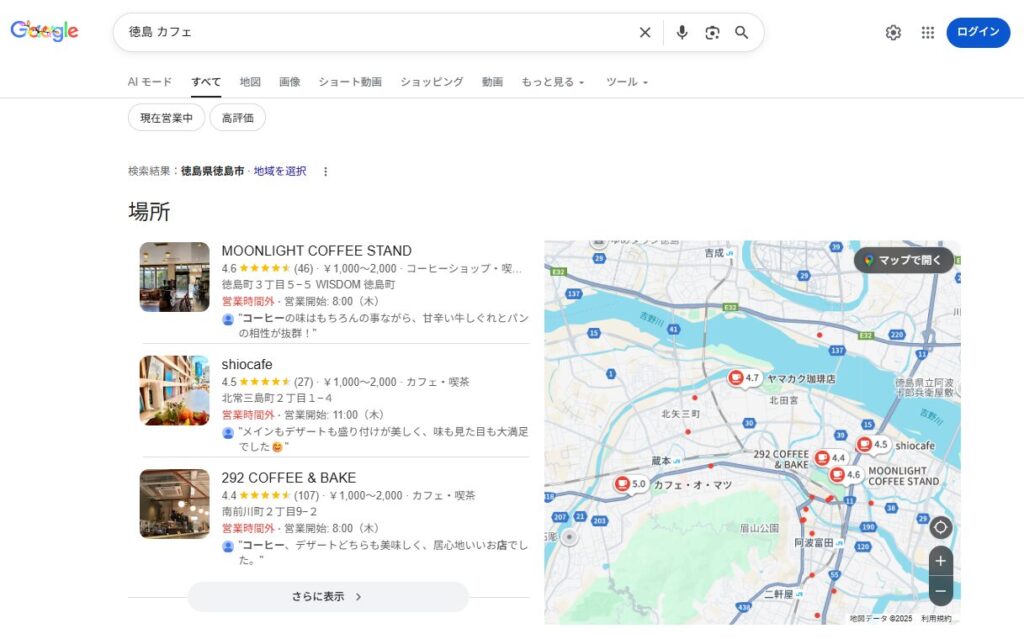 たとえば、ユーザーが「徳島市 カフェ」「徳島 美容室」といった地域名を含むキーワードで検索した際、マップ上の検索結果で自店舗を上位3位以内に表示させることを目標とします。