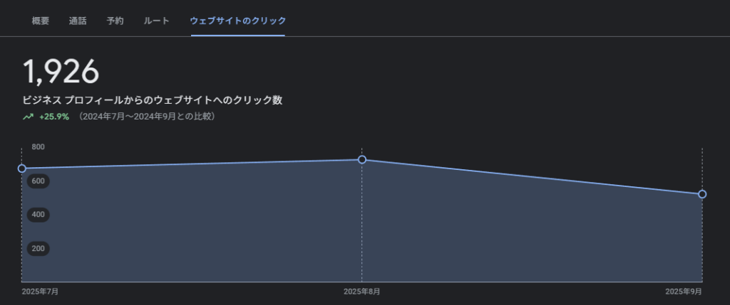 2025年7月が10件、2025年8月が4件、2025年9月が6件で、合計30件となっています。電話件数がホームページへの移行率と比べて少ないのは「サービス内容をよく見てから来店したい」と考えるお客様が多いサービス業の特性といえるでしょう。