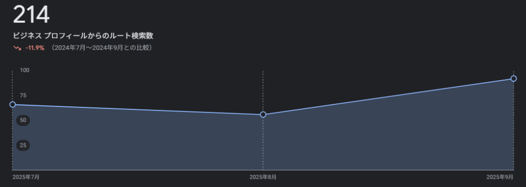 2025年7月が66件、2025年8月が56件、2025年9月が92件で、合計214件となっています。大体月に2人以上がルートを検索していますね。