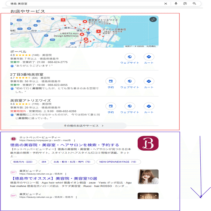 通常のSEO対策では、大手企業やポータルサイトが検索結果の上位を独占しがちですが、MEOでは実際にその地域に店舗を構える事業者のみが競合対象となります。たとえば、徳島市内の美容室の場合、同じ徳島市内の美容室とのみと競争すればよいだけなので上位表示しやすいです。
