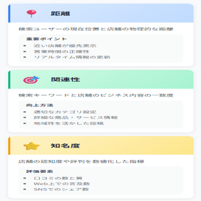 関連性は、Googleビジネスプロフィールの情報を充実させることで、高められます。具体的には、ビジネス カテゴリの適切な設定、商品・サービス情報の詳細な記載、店舗の特徴を表現する写真の投稿などが効果的です。